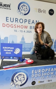 "Člověk míní, život mění". Nechtěli jsme rozšiřovat náš skotský klan o dalšího člena, ale pak se narodila ONA. Od samotného počátku průbojná sebevědomá a energická fenka, která po obou rodičích dostala to nejlepší. Její temperament jsme otestovali na Evropské výstavě psů v Brně, kde si odnesla svůj úplně první titul EUROPEAN PROMISE 2025. Na krásný úspěch navázala nedlouho poté, co vyhrála titul InTERRA Puppy WORLD WINNER. Jako juniorka se pomalu prosazuje navýstavách doma i v zahraničí Best Junior, BOS, ukončila juniorskou kariéru s vynikajícím výsledkem BIS junior 2 na speciální výstavě v Německu a dokončila Českého šampiona mladých. Moc těšíme na její další životní dráhu.
